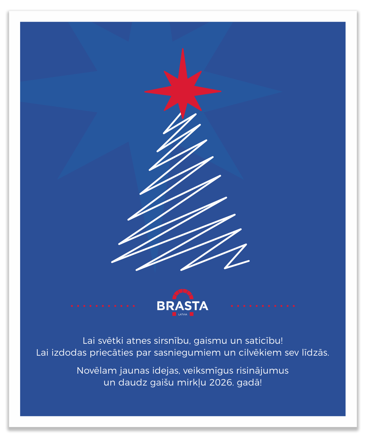 Lai svētku laiks ienes mieru, siltumu un prieku jūsu mājās, bet Jaunais gads – jaunus projektus, drosmīgas idejas un stabilu izaugsmi.